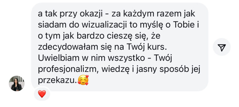 Dzięki swoim wizualizacjom nie tylko zyskałam uznanie, ale również zdobyłam większą ilość zleceń. Przekazuję Ci nie tylko teorię, ale sprawdzone praktyki, które poprawią jakość Twoich projektów i pomogą więcej zarabiać.
